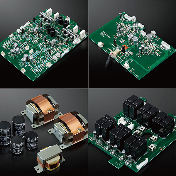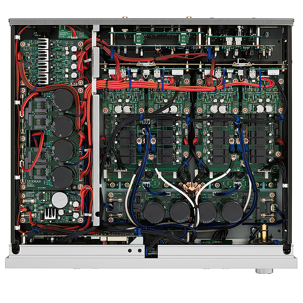 Блок питания оснащен двумя специально изготовленными высоковольтными трансформаторами типа OI, известными своей высокой стабилизацией, предназначенными исключительно для каждого канала. Кроме того, для периферийных цепей, таких как управляющие реле и светодиодные индикаторы, предусмотрен отдельный трансформатор. Выходной каскад включает четыре специальных фильтрующих конденсатора ёмкостью 10 000 мкФ, а каскад драйвера — четыре специальных фильтрующих конденсатора ёмкостью 3300 мкФ, каждый из которых настроен независимо для левого и правого каналов. Эта конфигурация соответствует традиционному стандарту LUXMAN для высокопроизводительных и высокостабильных цепей питания.