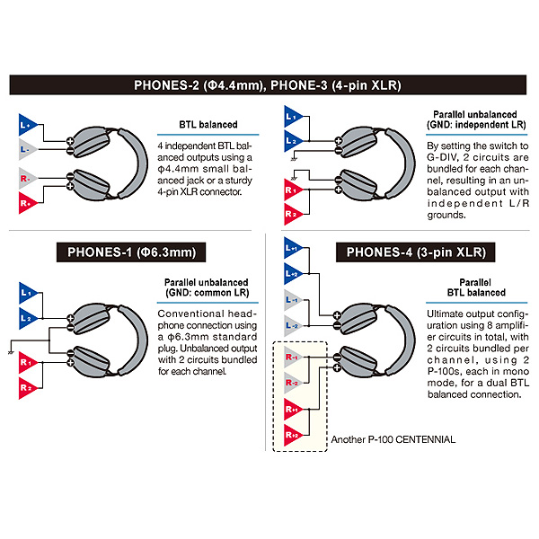 Такая схема улучшает разделение каналов, точность позиционирования, снижает интермодуляционные искажения и улучшает регулировку мощности. Небалансный выход: небалансный выход использует параллельную систему управления, объединяющую две схемы усилителей на канал для удвоения выходного тока, обеспечивая достаточную мощность. При использовании балансного выхода (разъём φ4,4 мм или 4-контактный XLR) переключатель позволяет работать в параллельном небалансном режиме с независимыми заземлениями левого и правого каналов. Для максимального удовольствия от прослушивания музыки через наушники, подключение двух усилителей P-100 Centennial через их 3-контактные выходы XLR обеспечивает параллельное балансное подключение BTL. В этом режиме задействуются все восемь доступных блоков усилителей, что удваивает выходной ток на канал и обеспечивает непревзойденное, изысканное звучание.