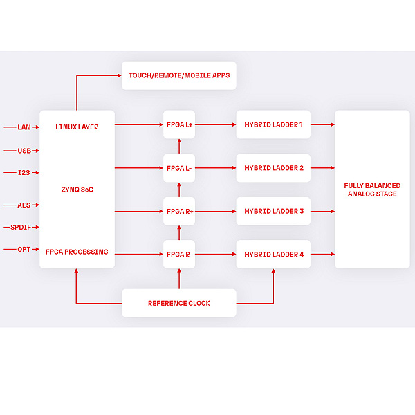 В основе Wavedream Reference лежит наша собственная архитектура, разработанная для высочайшего уровня точности и непревзойденного качества воспроизведения звука. Наш ЦАП построен на высокооптимизированном и эффективном чипе AMD/ZYNQ для главного контроллера/сетевого рендерера и четырёх ПЛИС, по одной на каждую фазу системы дискретного преобразования. Устройство работает под управлением специально разработанной ОС Linux от Rockna, которая отвечает за все, кроме обработки звука, которая выполняется специализированными аппаратными блоками.