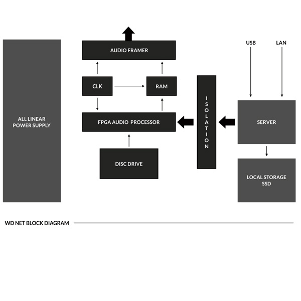 Wavedream NET построен на мощном цифровом аудиоядре, которое направляет все аудиоданные в большой буфер оперативной памяти. Аудиоданные выводятся после тактового генератора со сверхнизким фазовым шумом, что делает устройство практически идеальным источником. Мощный ПЛИС обеспечивает воспроизведение диска в монопольном режиме, полностью изолированном от сервера. Кроме того, ПЛИС содержит большое количество цифровых сигнальных процессоров (DSP), которые могут быть очень эффективны при обработке аудиопотоков в реальном времени, значительно экономя вычислительную мощность центрального процессора сервера.