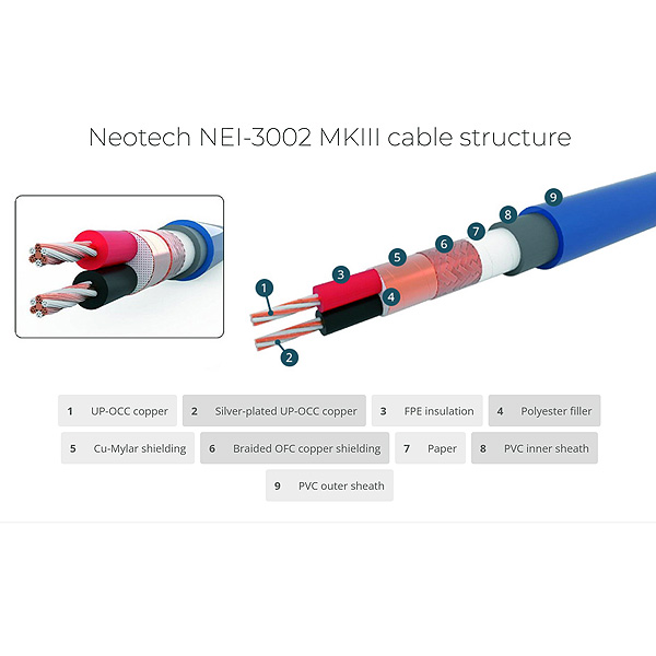 Информация взята с сайта avcomfort.ru Изоляция состоит из слоя теплоизоляции FEP и полиэфирного наполнителя в качестве диэлектрика. Для экранирования используется слой толстой медной фольги и медная оплетка OFC для обеспечения стабильной передачи сигнала и оптимального подавления шума. В качестве заключительных слоев кабель NEI-3002 MKIII имеет две ПВХ-оболочки. Общий диаметр кабеля составляет Ø10,7 мм.