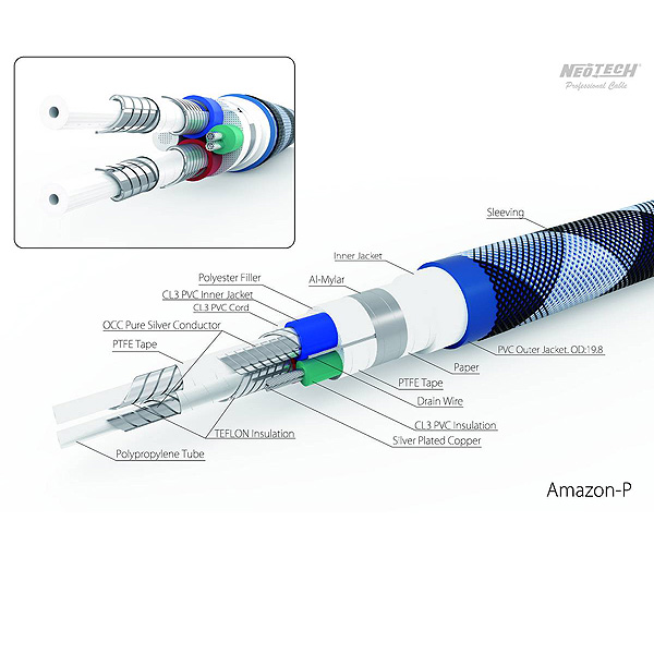 Сердцевина кабеля заполнена полиэстеровыми волокнами, к экрану прилегает дренажный провод, а основные проводники отличаются увеличенным сечением (на большое содержание серебра намекает показание прибора, которым можно измерить сопротивление — оно оказалось как минимум вчетверо ниже, чем по земляному проводу). Так что в виде The Amazon P мы получаем хорошо защищенную от электромагнитных помех силовую линию с очень низкими активными потерями. Вилки и разъемы — собственного производства NeoTech с безупречной полировкой контактов и родиевым покрытием.
