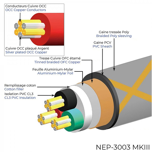 Информация взята с сайта avcomfort.ru Кабель питания NEP-3003 III довольно гибкий, благодаря использованию хлопкового наполнителя. Внешняя изоляция черного цвета с маркировкой для правильной сборки кабеля по направлению, поверх оранжево-серая нейлоновая оплетка.