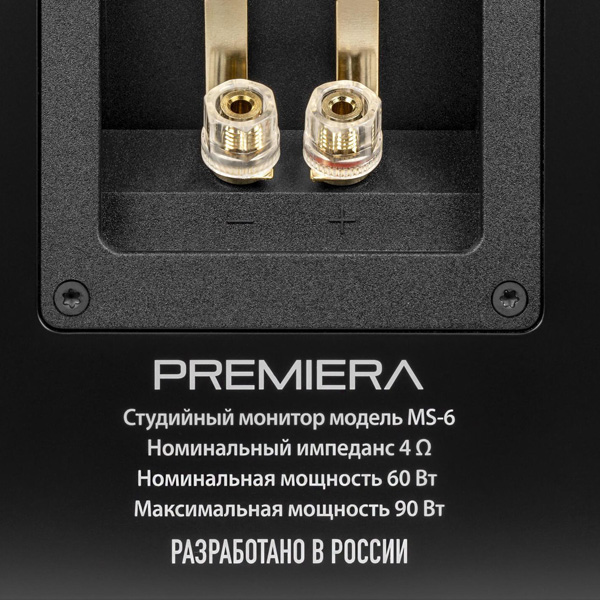Информация взята с сайта avcomfort.ru Premiera MS-6 «Studio 6» - двухполосные полочные профессиональные акустические системы с номинальной мощностью RMS 60 Вт. В акустических системах MS-6 установлены два излучателя: дюймовый твитер с шелковым куполом и вуфер диаметром 6.5 дюйма с диффузором из полипропилена. Используется разделительный фильтры 18 дБ/октава по НЧ и 12 дБ/ октава по ВЧ с трёхпозиционным переключателем регулировки частоты разделения. Нормируемый частотный диапазон при неравномерности ±3 дБ составляет 40 Гц — 20 кГц.
