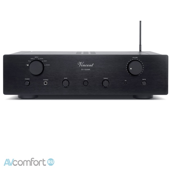Vincent SV-500 Mk располагает регуляторами высоких и низких частот с возможностью отключения функции темброблока. Также на передней панели усилителя имеется разъем для подключения наушников. Стильный внешний вид усилителя гармонично дополняется алюминиевым пультом дистанционного управления.