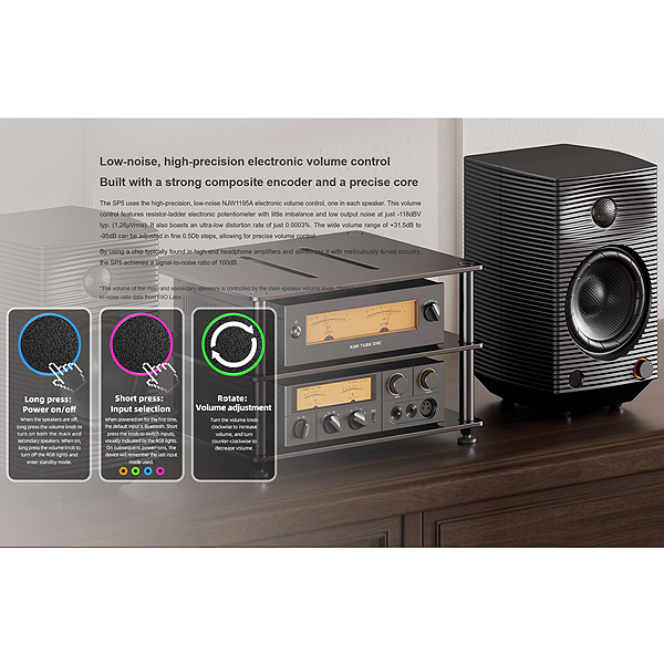 Регулировка громкости осуществляется с помощью высокоточного энкодера, обеспечивающего плавную электронную настройку. Регулятор обеспечивает точность по всему частотному диапазону, даже на малой громкости не теряются детали звуковой картины. Кроме того, акустические системы FiiO SP5 оснащены входом триггера 12 В, что позволяет колонкам включаться и выключаться синхронно с другими устройствами. Дополнительные элементы управления включают инфракрасный пульт д/у, RGB LED-индикаторы (с цветовой индикацией выбора входа), фронтальную ручку регулировки громкости — удобную, чувствительную и идеально расположенную для настольного использования...