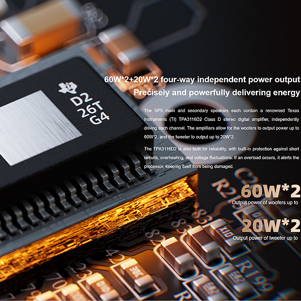 FiiO SP5 оснащена системой двойного питания — редкость для настольных акустических систем. Каждая колонка получает свой собственный, а не общий, источник питания мощностью 120 Вт, что помогает устранить межканальные помехи и обеспечивает стабильную подачу энергии. Каждый динамик обслуживается собственным усилителем – 60 Вт выделяется на НЧ/СЧ-динамик с диффузором диаметром 5,25 дюймов, выполненном из материала Rohacell, и 20 Вт – на 1-дюймовый купольный твитер из шёлкового композита.
