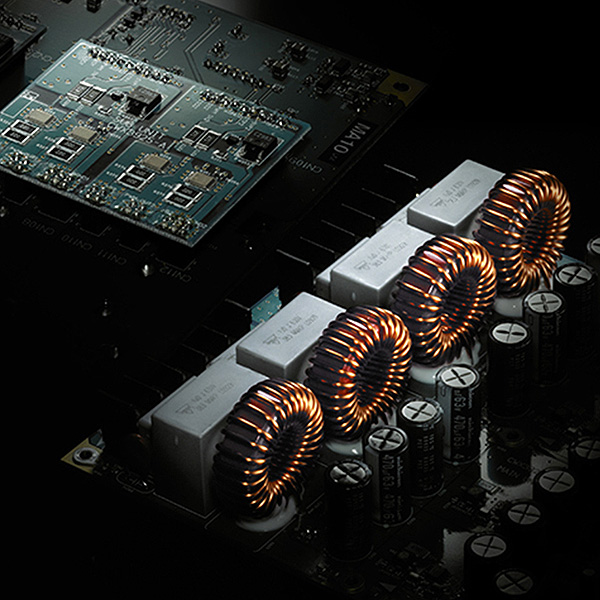 Интеграция аналоговой схемы питания, включающей два высокоемких тороидальных трансформатора и электролитические конденсаторы, с выходным каскадом класса D заложила основу для чистого каскада усиления и исключительно высокой скорости и мощного отклика. Прямые полевые транзисторы со сверхнизким сопротивлением в открытом состоянии в бесвыводных корпусах обеспечивают сигналы с резкими фронтами нарастания. Высокоэффективный выходной каскад класса D, выделяющий минимальное количество тепла и исключающий необходимость использования традиционных радиаторов, обеспечивает впечатляющую мощность в 250 Вт на канал.