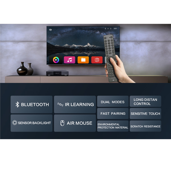 Для удовлетворения требований домашних кинотеатров и медиа-комнат UHP-3001 оснащен совершенно новым пультом дистанционного управления Bluetooth с подсветкой и датчиком движения. Подсветка, активируемая движением, идеально подходит для использования в медиа-комнатах или в условиях низкой освещенности ночью, обеспечивая более удобное управление и более продуманный пользовательский опыт. В дополнение к всенаправленному управлению по Bluetooth, устройство также оснащено встроенным шестиосевым гироскопом для удобной работы в режиме аэромыши, обеспечивая точную навигацию и щелчки при просмотре контента в особых сценариях использования. Кроме того, поддерживается функция обучения по инфракрасному излучению, позволяющая легко воспроизводить функциональные клавиши инфракрасных пультов дистанционного управления другого AV-оборудования.