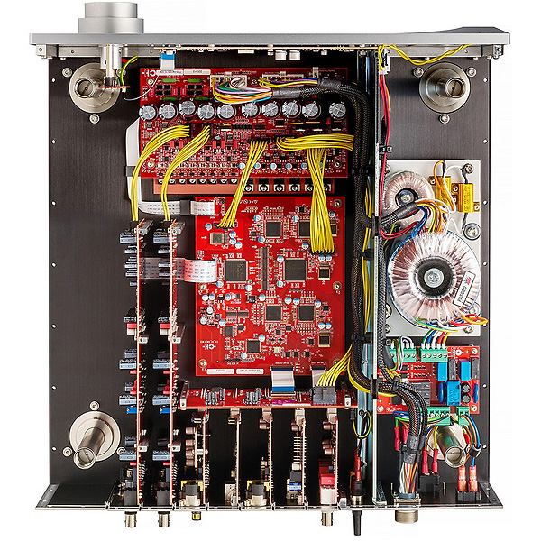 На этапе преобразования полностью дифференциальная двухканальная архитектура ЦАП использует четыре прецизионных R-2R преобразовательных сети на канал, при этом все резисторы установлены на общей кремниевой подложке для обеспечения исключительной термической стабильности, точности согласования и долговременной линейности. Такой подход обеспечивает выдающийся динамический диапазон, линейность и разделение каналов, а также подает сигнал на дискретный аналоговый выходной каскад класса А, который имеет постоянную связь и является полностью симметричным, гарантируя сохранение точности временной области, установленной в цифровой области, на аналоговом выходе без потерь или искажений.