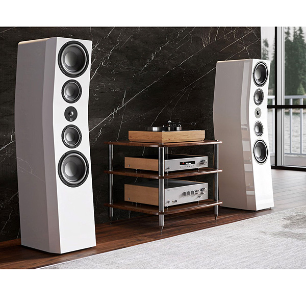 Среднечастотные динамики и низкочастотные динамики, расположенные выше и ниже твитера, обеспечивают плавное смешивание кроссоверов для создания идеализированного «точечного источника», где звук исходит из одной точки перед динамиком, оптимизируя характеристики рассеивания.