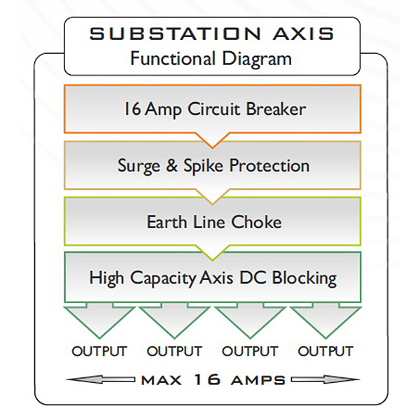 Модель Isol-8 SubStation Axis занимает промежуточное положение между LC и НС, обеспечивая защиту от постоянной составляющей и фильтрацию "земляной" линии. Она предназначена для питания аудиокомпонентов, для которых не требуется фильтрация помех.