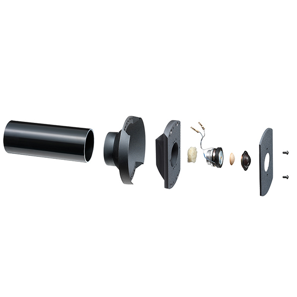 Корпуса Vienna Acoustics Haydn Grand в прекрасном шпоне розового дерева выглядят идентичными модели Mozart Grand (точнее, их верхней части), однако есть и специфическая изюминка. Вначале можно подумать, что акустическое оформление АС - закрытый ящик, поскольку нигде не видно отверстия для порта фазоинвертора. Но при ближайшем рассмотрении он все-таки обнаруживается, и в весьма неожиданном месте - за твитером. За вертикальной панелью с округлой тыльной стороной прячется сужающееся рупороподобное углубление, идущее внутрь корпуса и переходящее в трубу порта. Примыкания гладких поверхностей сложной формы, сделанные из алюминия методом литья, обеспечивают отсутствие турбулентностей на выходе и гашение стоячих волн в горле порта.