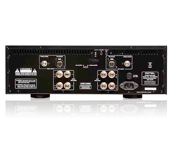 После общего тороидального трансформатора топология левого и правого каналов представляет два моноблока, а все шины заземления организованы «звездой» на общей медной пластине, чтобы обеспечить малый уровень шумов. Выходные каскады выполнены на дискретных биполярных выходных транзисторах – по 10 полупроводниковых приборов в каждом канале, рассчитанных на большие токи. Имеются как балансные XLR, так и небалансные входы на RCA разъемах.