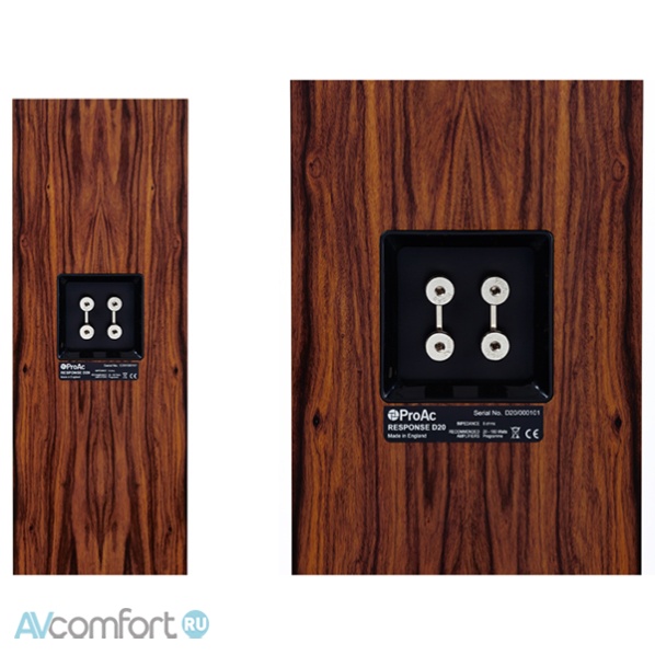 В ProAc Response D20R используется НЧ/СЧ динамик размером 165 мм с диафрагмой из стекловолокна, акриловый фазовый колпачок, магнитная система Excel. Твиттер – это фирменный ленточный твитер ProAc 60x10 мм с задней демпфирующей камерой. Кроссовер выполнен из отборных компонентов с высочайшим качеством монтажа. Разводка произведена многожильным кабелем из бескислородной меди. Существует возможность подключения по bi-wiring / bi-amping.