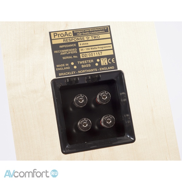 Акустические системы ProAc Response D Two поставляются в зеркальных парах – твитеры несколько смещены относительно вертикальной линии симметрии. При установке необходимо следить за тем, чтобы твитеры находились «внутри» акустической пары. Корпуса ProAc Response D2 изготовлены из березовой фанеры и тщательно задемпфированы. Стандартные варианты внешней отделки включают в себя натуральный шпон черного ясеня, красного дерева, вишни или клена, за дополнительную плату можно заказать отделку шпоном эбенового дерева или клена «птичий глаз». Качество сборки и внешней отделки акустических систем, которые, кстати говоря, до сих пор производятся в Великобритании (Brackley, Northamptonshire), является безупречным, а использование лучших сортов шпона позволяет им стать настоящим украшением интерьера. И хотя корпус может показаться внешне вполне обычным, он скрывает передовые технологии, которые используются для придания ему жесткости и отличного демпфирования. Коммутационные клеммы, расположенные на терминальной панели в нижней части акустических систем, покрыты родием и допускают подключение по схемам bi-wiring/bi-amping.