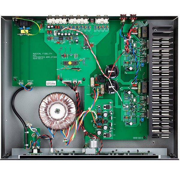 Выходная мощность усилителя составляет 85 Вт на канал при сопротивлении 8 Ом. Специальная конструкция источника питания в сочетании с раздельными мощными фильтрующими конденсаторами большой емкости позволила инженерам минимизировать перекрестные помехи. Уровень нелинейных искажений Musical Fidelity M3si измеренный на частоте 1 кГц не превышает 0,007%, а на частоте 10 кГц составляет всего 0,01%. Такое значение коэффициента гармоник практически независящее от частоты входного сигнала можно считать своеобразным рекордом для Hi-Fi аппаратуры. И именно этот факт лучше всего подтверждает оптимальность всех схемотехнических решений.