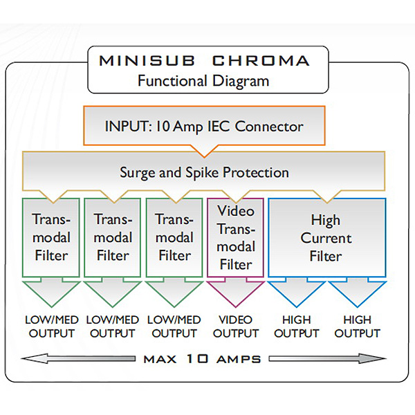 Информация взята с сайта avcomfort.ru В конструкции Isol-8 MiniSub Chroma учтен тот факт, что видеоустройства, сильноточные и слаботочные компоненты нуждаются в различных схемах фильтрации сетевого напряжения для полной реализации заложенного в них потенциала. Поэтому, как и в топовых моделях фирмы, в MiniSub Chroma используются раздельные фильтры для каждого типа AV-оборудования, что гарантирует превосходный результат его работы.
