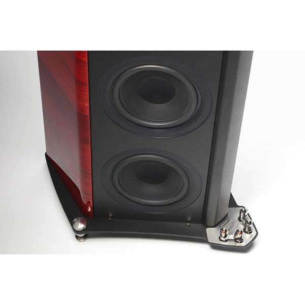 Информация взята с сайта avcomfort.ru Головки установлены в нижней части корпуса на боковой стенке в отдельном отсеке с акустическим оформлением Stealth Reflex. Это достаточно сложный фазоинвертор с малой скоростью воздушного потока и, соответственно, без турбулентных призвуков. Тандем озвучивает диапазон 25 — 80 Гц, и это на самом деле полноценный сабвуфер, конструктивно развязанный от остального объёма корпуса. Басовая секция также представлена парой головок с аналогичными по структуре диффузорами, но меньшего, 180-миллиметрового калибра. Они расположены на лицевой панели Sonus Faber IL Cremonese, и также работают в отдельной камере с оформлением Stealth Reflex. Собственное «помещение» отведено и среднечастотному излучателю, и его объём тщательно рассчитан для достижения максимальной линейности в самом важном для нашего слуха диапазоне 250 – 2500 Гц. Для снижения массы подвижной системы звуковая катушка намотана омеднённым алюминиевым проводом. В неодимовой магнитной системе приняты меры для снижения потерь на вихревые токи.