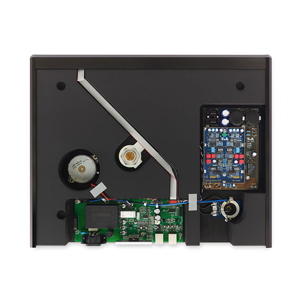 Если снять нижнюю крышку, увидим плату блока питания с DSP-модулем, который обеспечивает точность скорости вращения. От него запитаны сразу и мотор, и встроенный фонокорректор. Последний, если установлен, также виден под крышкой.