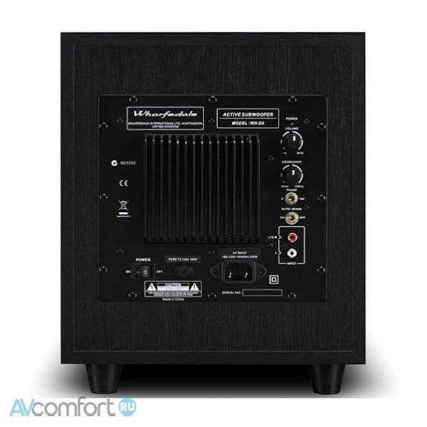Для обеспечения оптимальной нагрузки басовика с учетом небольшого внутреннего объема корпуса сабвуфер оснащен фазоинвертором. Низкочастотный динамик в Wharfedale WH-D8 подключен к усилителю с номинальной выходной мощностью 70 Вт. Для более эффективного отвода тепла от выходных каскадов усилителя последние смонтированы на радиаторе, внешняя часть которого выведена на заднюю панель сабвуфера.