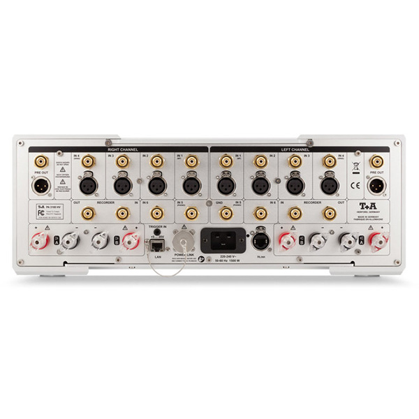 Предусмотрено четыре входа в конфигурации RCA и XLR. Также доступны два дополнительных входа в конфигурации только RCA. Доступны две пары акустических клемм на канал. Они совместимы как с лопаточными, так и с однополюсными клеммами. Эти клеммы имеют родиевое покрытие, обычно обеспечивают лучший электрический контакт, чем золотые или серебряные, и стоят дороже. Двухпроводное подключение легко реализуется благодаря двум парам клемм на канал. На задней панели также расположено соединение «H-Link», позволяющее соединять несколько компонентов T+A и управлять ими с одного пульта дистанционного управления.