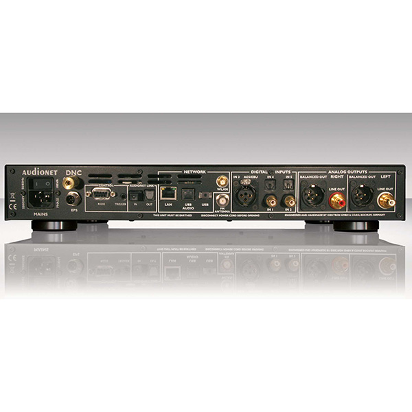 Audionet DNC максимально оборудован. Он может получать Интернет и FM-радио, предлагает USB 2.0 (USB Audio) и цифровой интерфейс USB-A. Каждый вход является независимым и может иметь согласованные входные уровни. DNC имеет оптический вход и выход Audionet для удаленного переключения между компонентами и использует сетевой фазовый монитор. DNC может использовать внешний источник питания (Audionet EPS G2 или EPX) для еще более чистого питания.