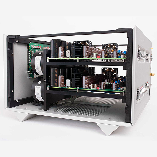 Регулятор громкости на двойной шарикоподшипниковой оси с магнитным храповым и оптическим датчиком. Громкость контролируется электронными коммутаторами с линейными резисторами. Питание постоянного тока, без конденсаторов или катушек, уменьшающих громкость, кратчайшие пути прохождения сигнала. Раздельные трансформаторы для положительной и отрицательной полуволны для каждого канала, что говорит об идеальном источнике питания. Четыре инкапсулированных и развязанных тороидальных трансформатора 50 ВА. Конденсаторы основного питания 22 000 мкФ, оптимизированы для очень низкого импеданса и выполнены с использованием шелкового диэлектрика. Общая емкость составляет 176 000 мкФ.