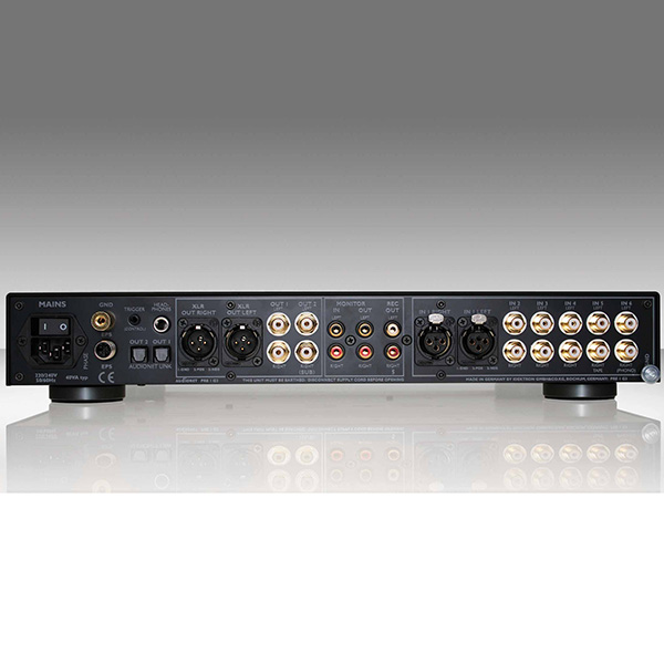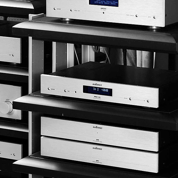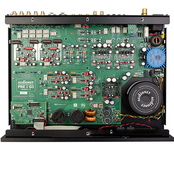 В случае Audionet входной буфер представляет собой каскадный, самозагружаемый монолитный двойной полевой транзистор, обеспечивающий практически бесконечное входное сопротивление. Драйверный каскад со связью по постоянному току усиливает сигнал без искажений для последующей схемы. Громкость и баланс устанавливаются с помощью электронно-коммутируемой, линеаризованной в реальном времени высокоточной резисторной цепи.