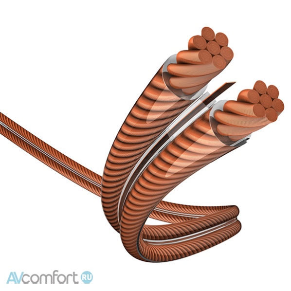 Информация взята с сайта avcomfort.ru Магнитные поля, возникающие в отдельных проводниках, перекрываются и нейтрализуются благодаря сложной многожильной структуре. Таким образом, даже очень высокие звуковые частоты передаются без препятствий и временной задержки. При возрастании частоты сигнал проходит преимущественно по поверхности проводника (скин-эффект). Высокоскоростная волноводная технология противодействует этому и увеличивает эффективно используемую площадь поперечного сечения для равномерной картины звучания.
