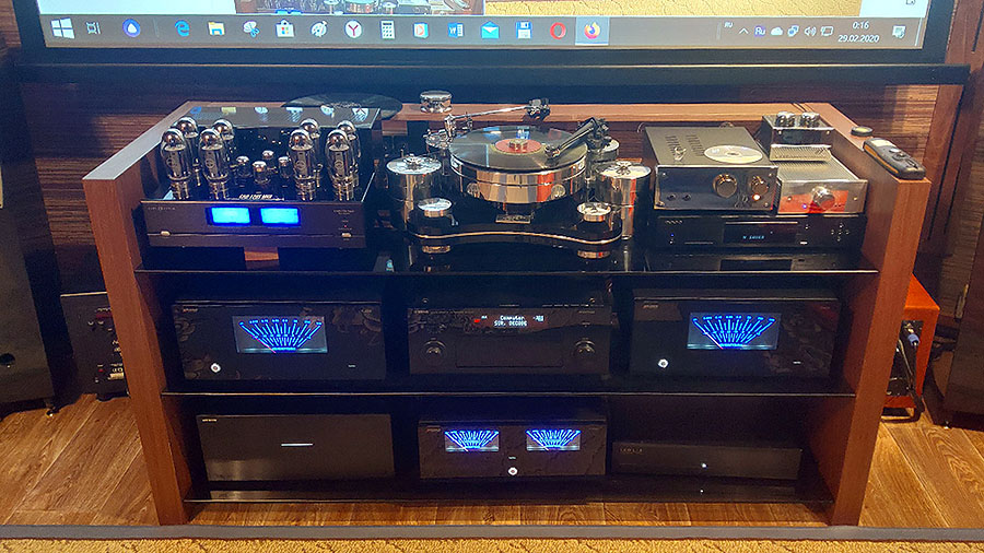 Инсталляция с проигрывателем виниловых дисков Transrotor Zet3, фонокорректором EAR 88P, усилителем Cary Audio CAD120S MkII. А также 4k видеопроектор JVC DLA-NX9.