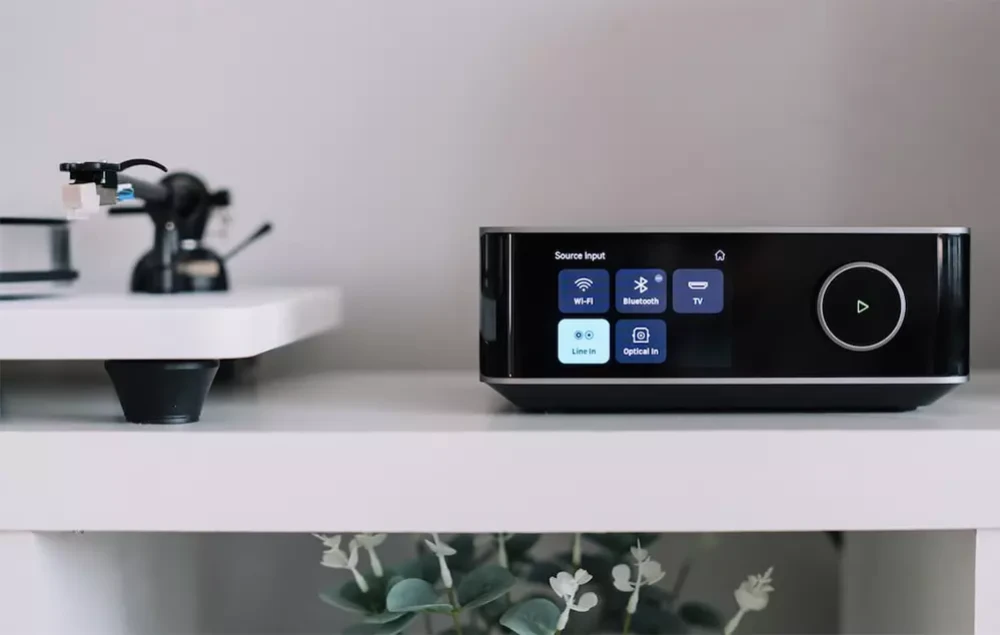 На передней панели усилителя WiiM Amp Ultra расположен 3,5-дюймовый сенсорный экран, предоставляющий доступ к управлению воспроизведением, переключению входов, настройке эквалайзера, просмотру списка воспроизведения, стрелочным индикаторам уровня сигнала, списку недавно проигранных треков, Интернет-радио и многому другому. Справа от дисплея расположен многофункциональный поворотный регулятор. С его помощью вы можете получить доступ к 24 предустановкам эквалайзера, 10-полосному графическому и параметрическому эквалайзеру с отдельными настройками по входам, а также встроенной системе коррекции звучания, учитывающей акустические особенности помещения.