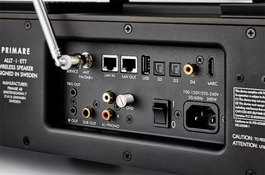 Коммутационный арсенал Primare Allt-i-Ett довольно обширен: порт HDMI eARC, аналоговые и цифровые входы, включая вход фонокорректора, FM/DAB+-радио, а также беспроводной стриминг через AirPlay 2, Spotify Connect, Qobuz Connect, Tidal Connect и Bluetooth. Предусмотрен выход на активный сабвуфер с управлением басом, а также проводные и беспроводные опции для наушников.
