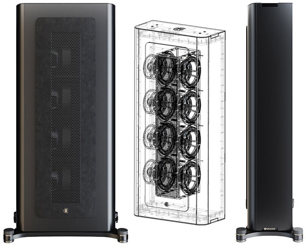 Восемь драйверов 8,5” с ходом ±18 мм в пушпуле установлены по принципу force-cancelling (закреплены попарно магнитами друг к другу, что приводит к подавлению их вибраций). Усилитель — внешний DSP3000A с мощностью 3000 Вт RMS.