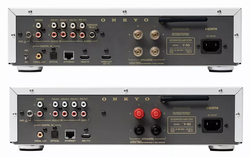 Старшая модель Onkyo Y-50 оснащена тремя аналоговыми линейными входами RCA, коаксиальным цифровым входом, портом HDMI ARC для подключения телевизоров и игровых консолей и встроенным фонокорректором MM/MC. Порт Ethernet и адаптер Wi-Fi входят в стандартную комплектацию, как и поддержка всех основных стриминговых протоколов. Выход pre-out для сабвуфера и улучшенные винтовые акустические терминалы завершают оснащение задней панели.