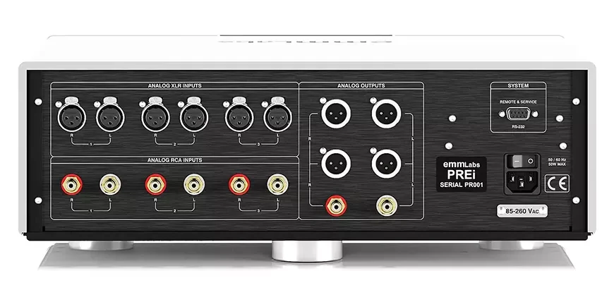Коммутационный арсенал предусилителя EMM Labs PREi включает шесть аналоговых стереовходов – три балансных на разъёмах XLR и три несимметричных на RCA. Также здесь есть три выхода – два балансных и один несимметричный. Входное сопротивление составляет 40 кОм для балансного входа и 20 кОм для несимметричного, выходное — 150 Ом (балансный) и 75 Ом (несимметричный), что обеспечивает совместимость с широким спектром оконечных усилителей.