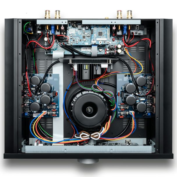 Новый интегральный усилитель M6xi выпущен на смену предшествующей модели M6si. Секция усиления класса АВ построена на основе платформы Titan и обеспечивает выходную мощность 2 х 230 Вт на 8 Омах или 2 х 390 Вт на 4 Омах — у M6si выходная мощность на 8 Омах не превышала 2 х 220 Вт. Блок питания полностью линейный. Выходные каскады построены на транзисторах Дарлингтона. В предварительной секции используется ступенчатый аттенюатор на микросхеме Burr-Brown, имеются фиксированные и регулируемые линейные выходы, к которым можно подключить дополнительный усилитель мощности (для bi-amping) или активный сабвуфер. Встроенный фонокорректор поддерживает картриджи MM и MC. Наиболее существенные отличия от предшествующей модели: встроенный ЦАП с оптическим и коаксиальным входами, портами USB-C и HDMI ARC. Разъем USB-A предназначен для питания внешнего стримера, а RS232 — для интеграции в системы управления. Сетевой функционал, как и прежде, отсутствует.
