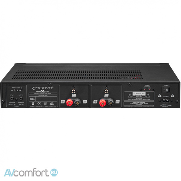 Информация взята с сайта avcomfort.ru Emotiva BasX A-150 обладает всеми необходимыми функциями, которые характеризуют отличный аудиокомпонент. Схема в BasX A-150 оснащена мощным линейным источником питания, с отличными звуковыми характеристиками, модулями усилителя класса A/B с коротким путем сигнала, триггерным входом и выходом, и стандартными небалансными аудиовходами. Он оснащен защитой от перегрузок аудиофильского качества, которая полностью прозрачна при нормальной работе, но при этом защищает A-150 и другое оборудование от общих сбоев. Emotiva BasX A-150 обеспечивает реальное аудиофильское качество звука и его характеристики подтверждают это: 75 Вт RMS на канал при менее чем 0,1% THD на 8 Ом; THD + N менее 0,02%; соотношение сигнал/шум 120 дБ, на полной мощности.